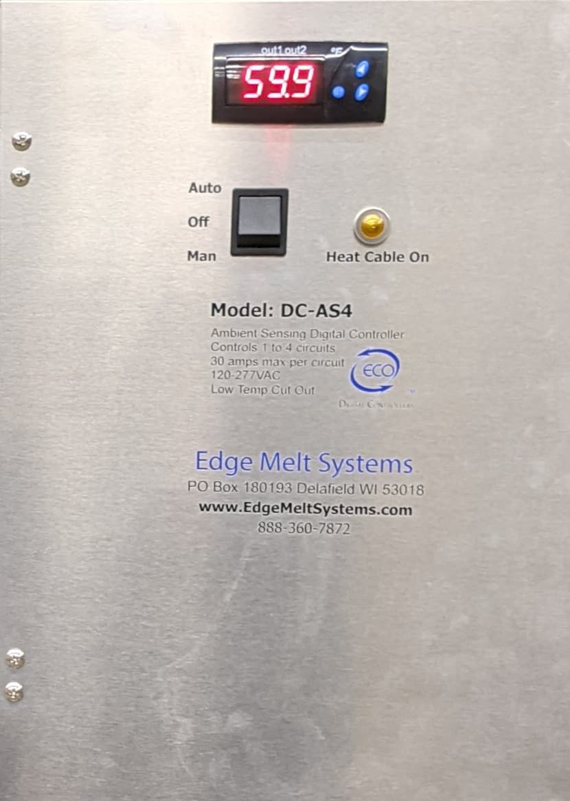 The DC Series of ice dam prevention system controllers allows for automatic operation of the Edge Melt Systems heated roof panels and heated gutter guards.